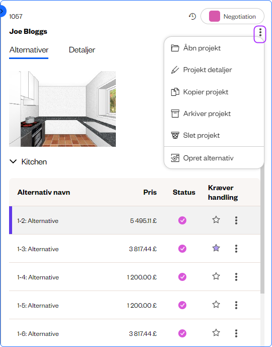 - Se projektdetaljer og åbn, dupliker, slet eller arkiver det