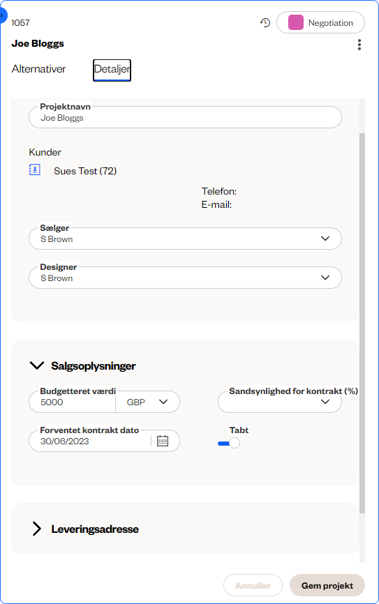 - Her kan du indtastebudgetteret værdi, kontraktsandsynlighed og forventet kontraktdato. Du kan også identificere, hvornår et projekt er gået tabt.