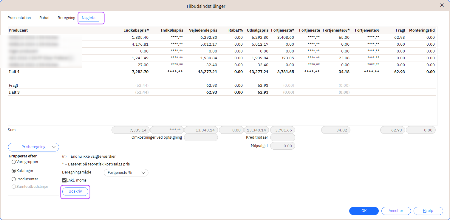 Til sammenligning kan du bruge en udskrift i Tilbudsopsætning/resumé > Nøgletal ringede Beregningsoversigt: