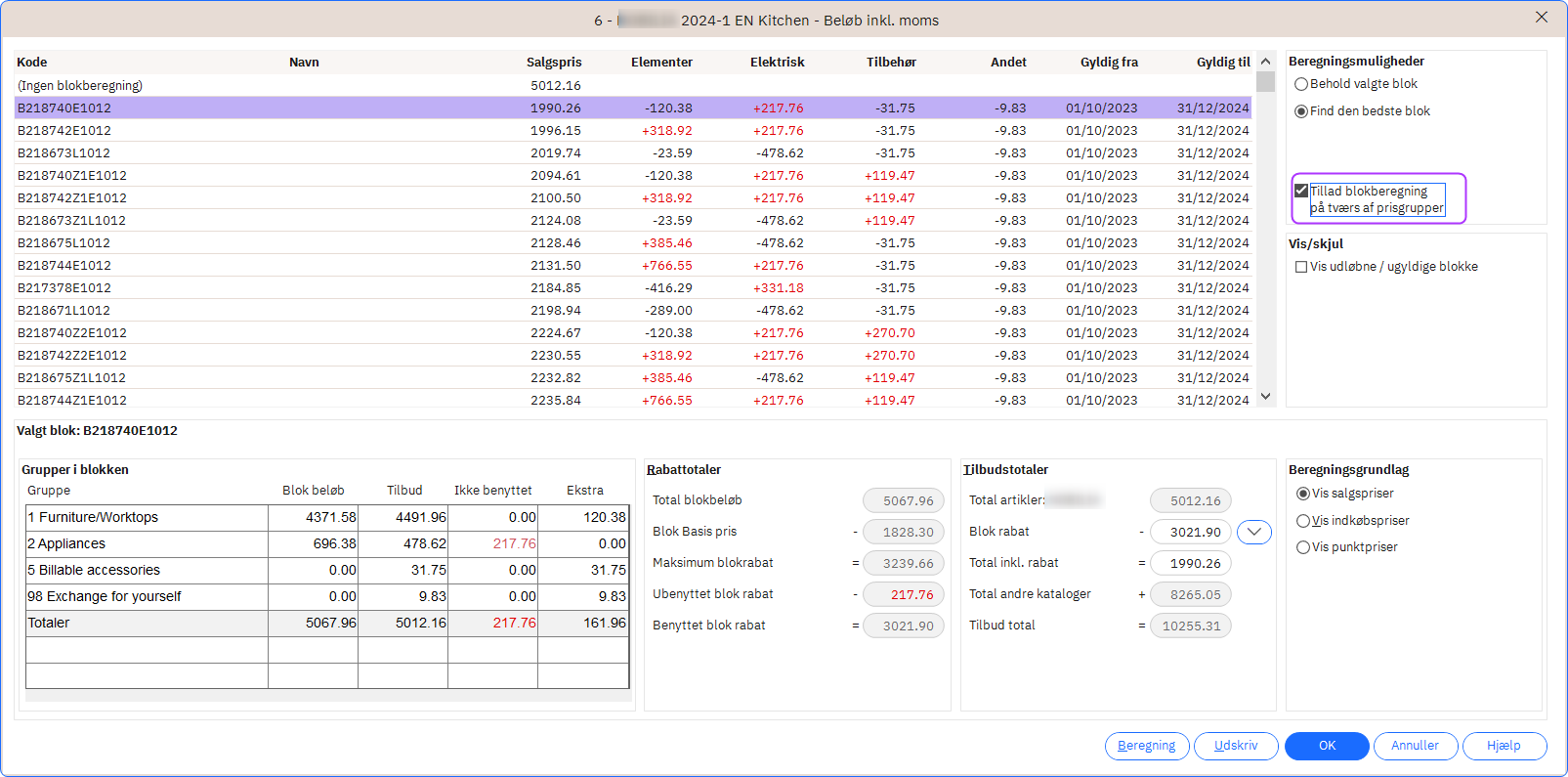 Hvis du bruger blokberegninger, bør du også tjekke det Tillad blokberegning på tværs af prisgrupper er afkrydset: