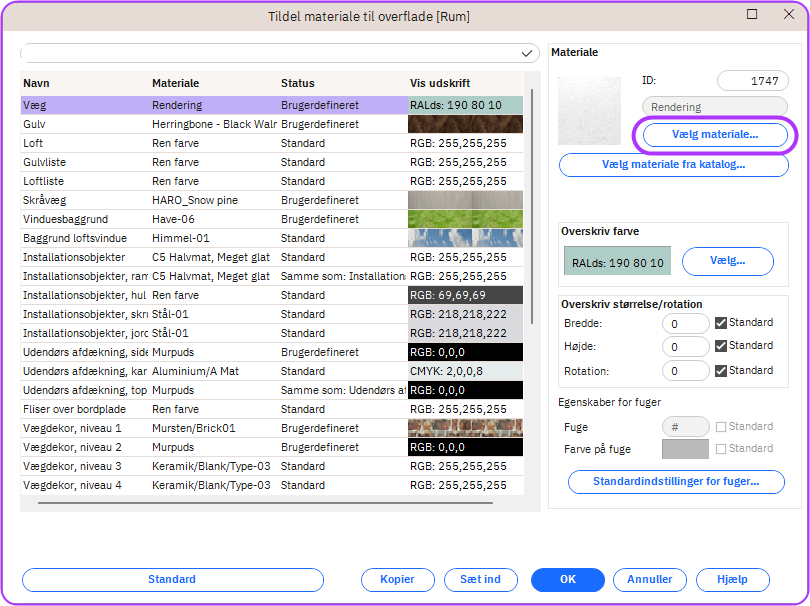 - Er flise: Hvis en specificeret størrelse blev defineret i pkt. 2, vil markering af denne aktivere fugefunktionen i dialogvinduet “Tildel materiale”.