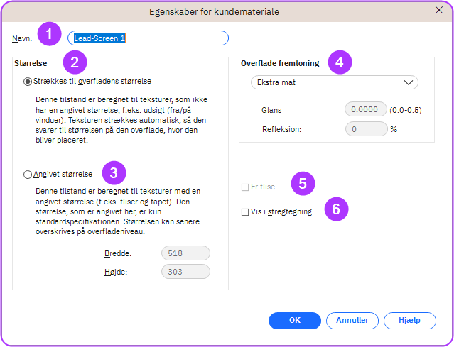 - Overfladeudseende: I rullemenuen findes 6 standard skabeloner fra “Ekstra mat” til “Gloss 100%”. Den 7ende mulighed “brugerdefineret” kan bruges til manuelt at definere glans- og refleksværdier.