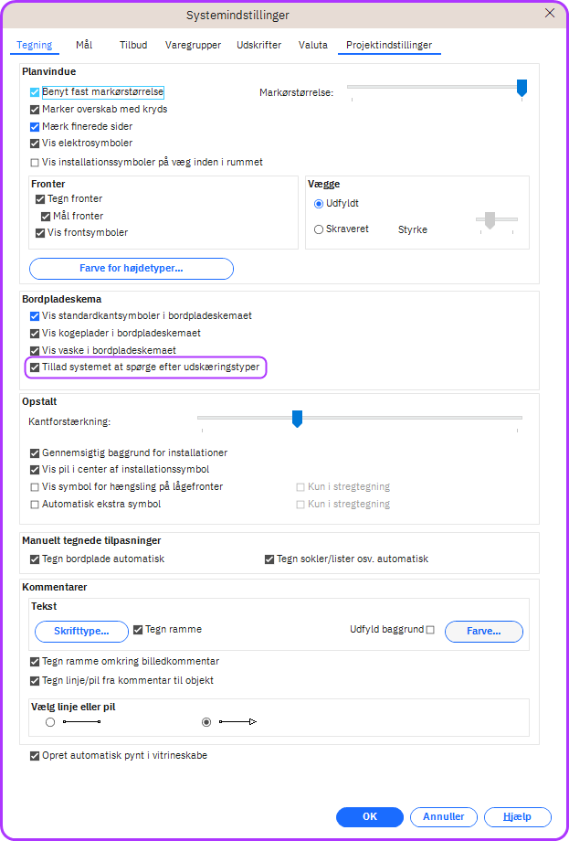 I bordpladeskema, når en kode tildeles, spørger et vindue, om der skal udføres snit på stedet. Winner vil nu automatisk anvende den foreslåede udskæringstype for alle Projekter når Tillad systemet at spørge efter udskæringstyper er ikke markeret Systemindstillinger, hvilket eliminerer pop op-vinduet, der beder dig om at bekræfte udskæringstypen, og sparer tid under designet.
