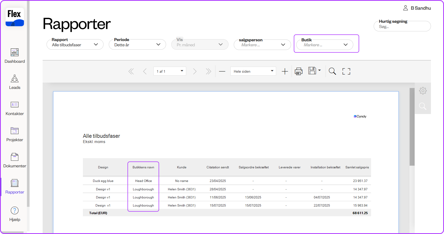 Rapporten for alle tilbudsfaser er blevet forbedret og indeholder nu en kolonne for Butik navn, at Projekt er inde. Dette giver dig mulighed for at sortere oplysningerne i butikker, så du kan sende de korrekte oplysninger til det relevante team.
