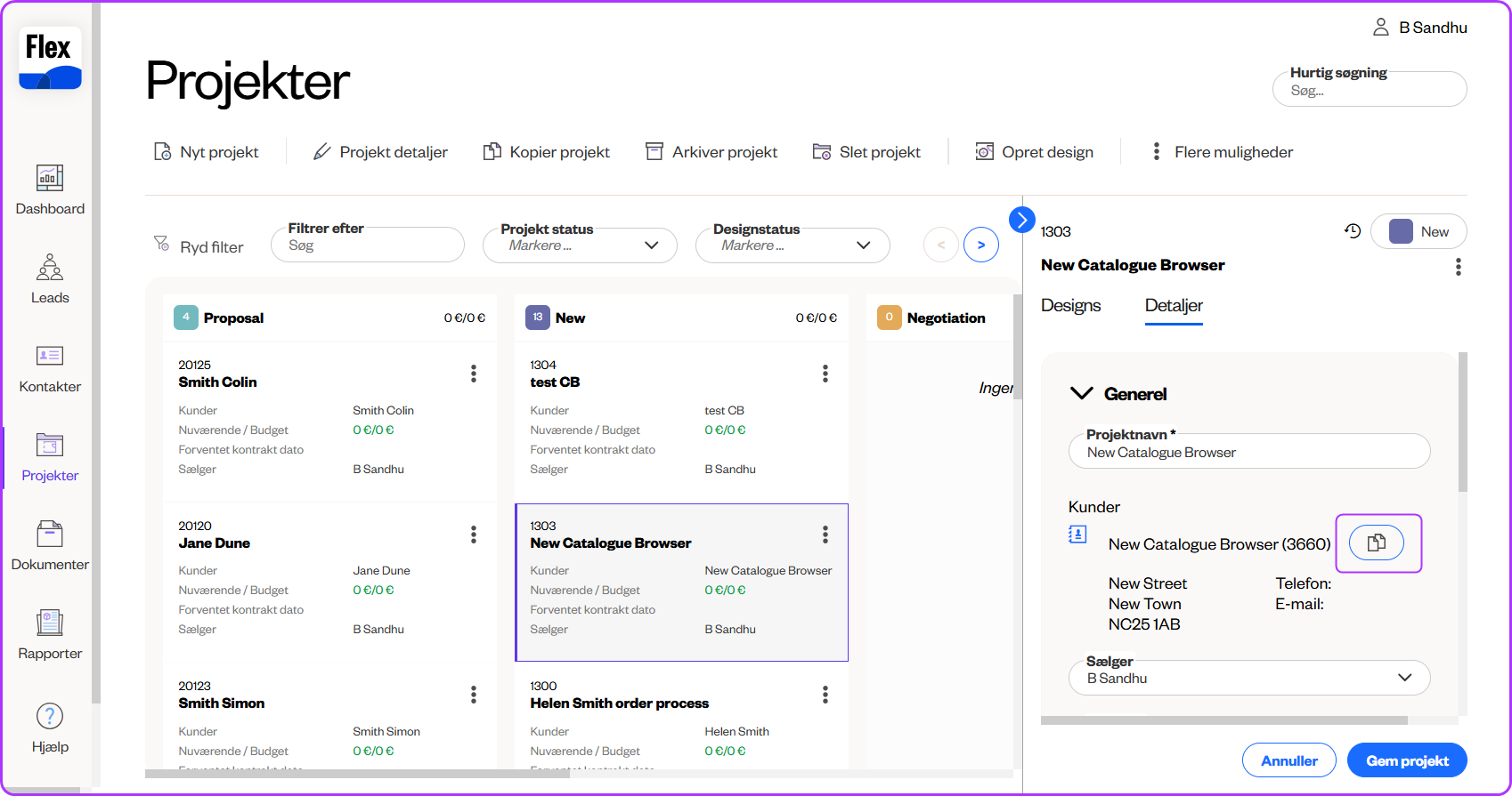 På Flex-platformen kan du kopiere en kontakts oplysninger til et udklipsholder for at indsætte dem i et andet program. Du kan gøre dette fra Projektdetaljer siden samt sidebjælken på Projekter side. For mere information Klik her.