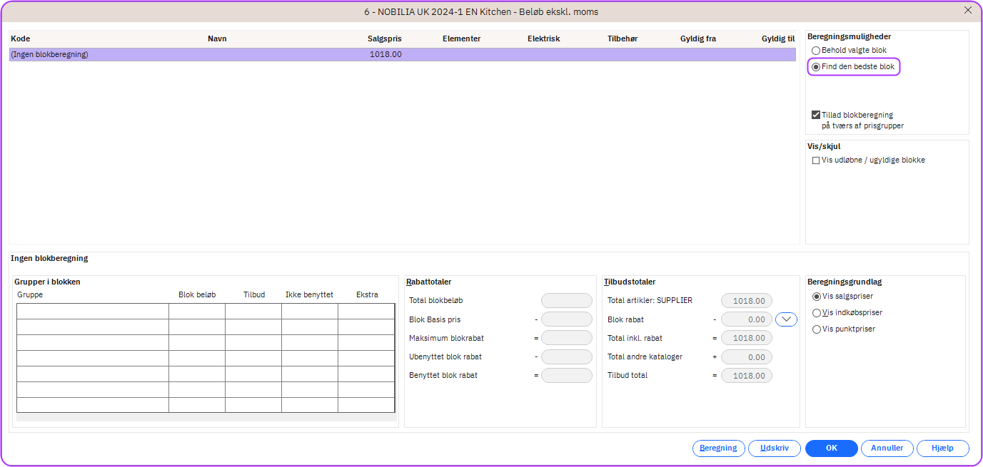 I Systemindstillinger for Tilbud kan du vælge en mulighed for at indstille Winner til automatisk at foreslå den bedste blokberegning. Tidligere ville den kun forudvælge denne mulighed første gang du gik ind i vinduet Blokberegning, og ville derefter vende tilbage til Behold valgt blok. Forretningsreglen er blevet opdateret i denne version til nu at beholde muligheden Find den bedste blok som den forudvalgte mulighed indtil du manuelt har ændret blokrabatindstillinger eller valgt en anden blok, eller når designet har status Tilbud sendt. For mere information om Blokberegninger klik her.