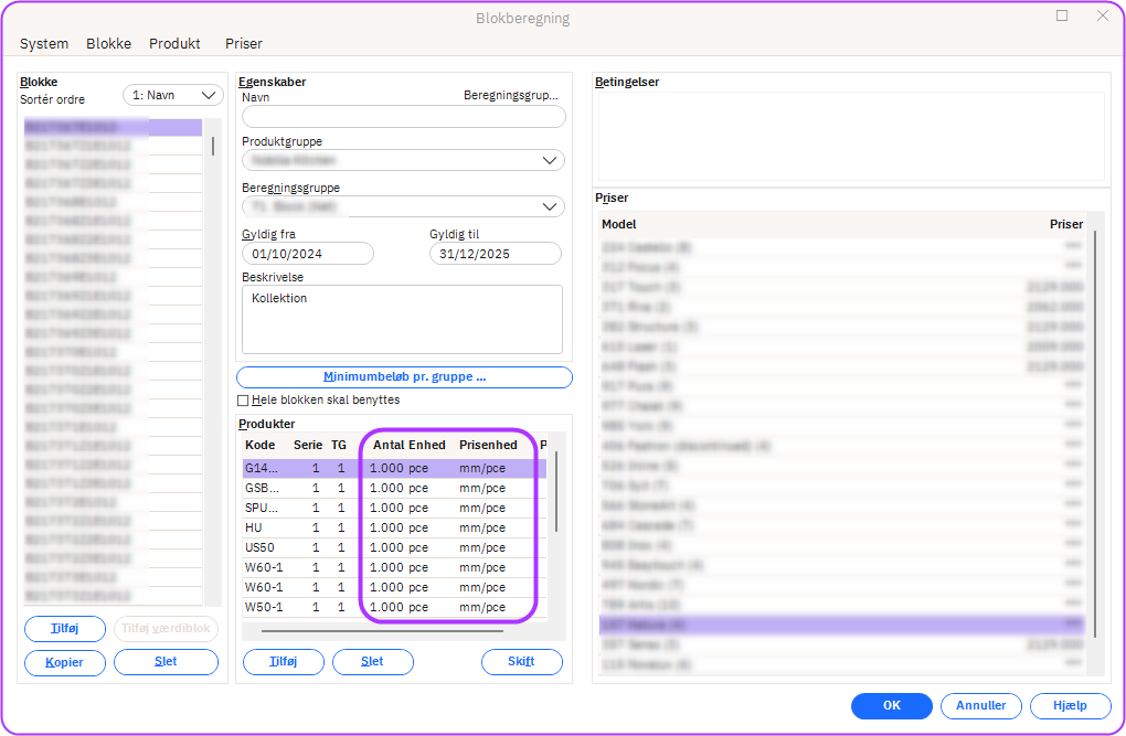 Nogle kataloger indeholder artikler, der beregnes med en pris pr. decimeter i kataloget, men som skal præsenteres som meter i tilbuddet. Disse forskelle blev ikke tydeligt fremhævet i block-beregningsdialogen tidligere. For at reducere forvirring er der tilføjet en ekstra kolonne for Pris enhed i block-dialogen for klarhed. Når et produkt ændres, opdateres Enhed, Pris enhed og relaterede produktgruppeoplysninger nu konsekvent, hvilket sikrer, at de viste enheder bedre afspejler, hvordan produkter vises og prises. For mere information klik her.