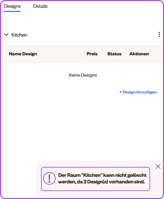 Hinweis: Wenn das Projekt den Status Angebot gesendet gegen ein Design hat, können Sie das Projekt nicht löschen, bis das Design auf verloren gesetzt oder das Angebot gelöscht wurde.