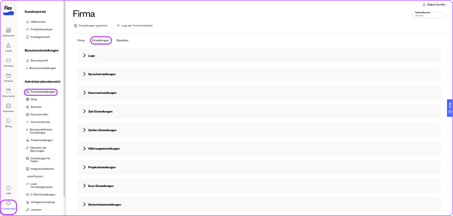 Wenn Sie über Flex-Systemadministrator-Benutzerrechte verfügen, können Sie Änderungen an den Unternehmenseinstellungen auf der Flex-Plattform vornehmen. Sie können den Namen, die Adresse, Kontaktinformationen, Währung, das Logo und Sicherheitseinstellungen ändern.