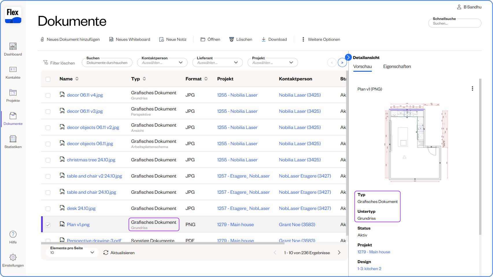 Neuer Untertyp für grafische Dokumente – Auf der Flex-Plattform kann ein grafisches Dokument jetzt in den Untertypen Grundriss, Perspektive, Ansicht und Arbeitsplattenschema gespeichert werden. Beim Anzeigen von Dokumenten auf der Plattform kann auch nach dem Untertyp gefiltert werden.