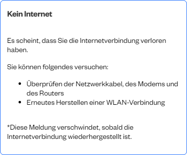 - Klare Meldung bei Unterbrechung der Internetverbindung - Bei Unterbrechung der Internetverbindung erhalten Sie eine Nachricht. Damit wissen Sie, dass Maßnahmen ergriffen werden müssen: