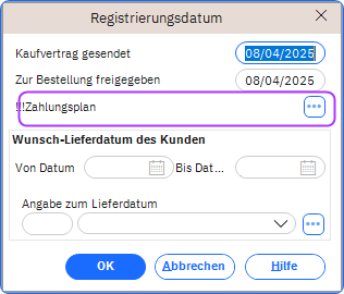 ODER - Ab Version 12.5a2 können Sie beim Drucken des Kaufvertrags auf das Symbol „Weitere Optionen“ klicken, um den Zahlungsplan zu öffnen.