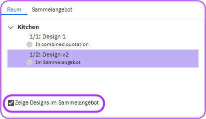 Wenn eine Design zu einem Sammelangebot zusammengefasst wurde, wird sie nicht unter Raum angezeigt.