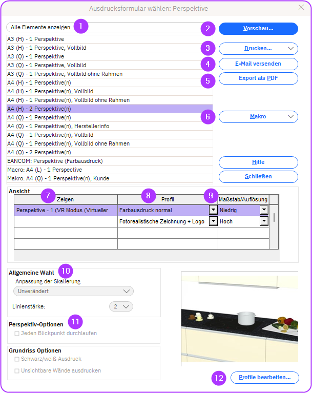 Wenn der Nutzer in Winner eine perspektivische Zeichnung drucken möchte, zeigt das Fenster Ausdrucksformular wählen: Perspektive die verfügbaren Optionen und Formulare an.