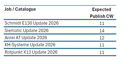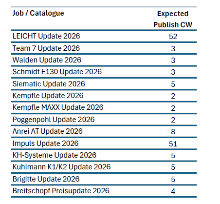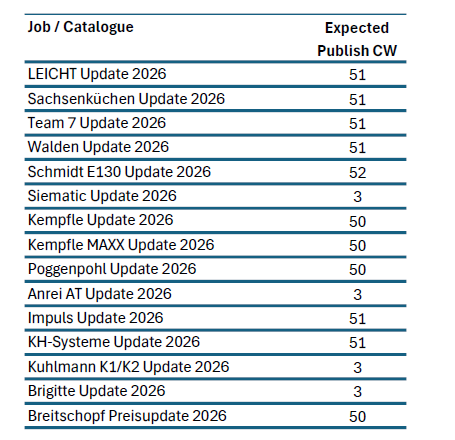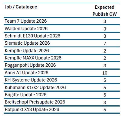 - Expected Publish CW = geplante Veröffentlichung des Katalogs (Kalenderwoche)