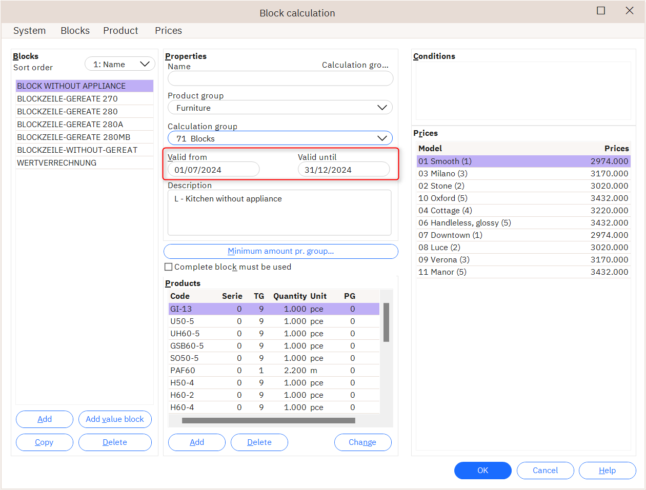 Here you can see the blocks listed. If the Blocks button is greyed out there are no blocks for this catalogue and therefore no block calculation is possible.