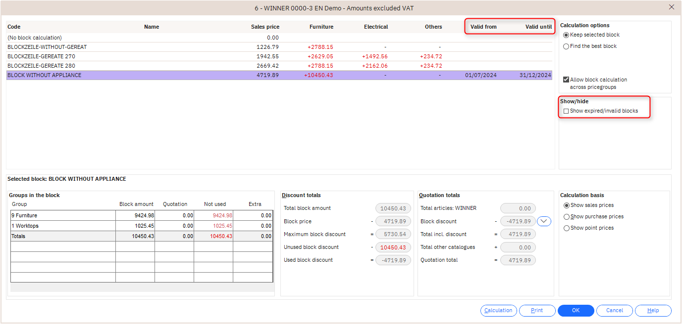 In Winner, some catalogue suppliers use a Block calculation to apply special discounts to certain groups of products. If you cannot access the block data try the following solutions: