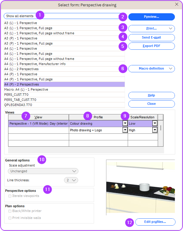 Views - The various settings for the selected print forms appear in this group box. The settings which appear are the profile name, the type of drawing for example, a line drawing, and the scale/resolution of the print form.
