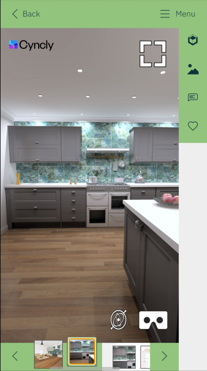 If your customer views the plan from a smartphone, they will be able to view the kitchen in 360° directly with VR glasses by enabling the VR mode on their phone.