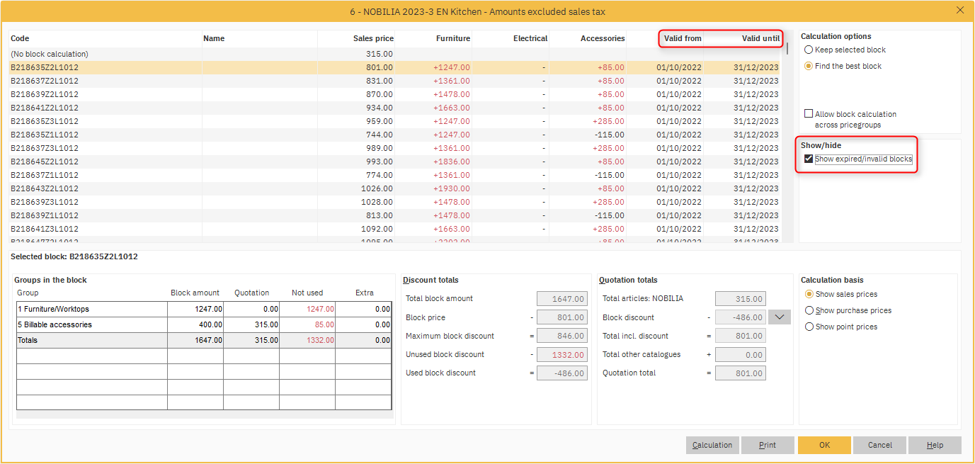 Here you can see the blocks listed. If the Blocks button is greyed out there are no blocks for this catalog and therefore no block calculation is possible. - If you believe you should have blocks data available, then: