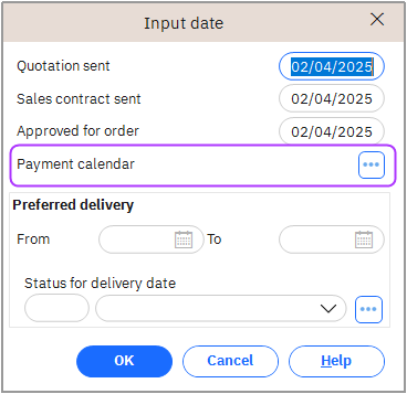 You can update the payment calendar for an alternative in the Invoices and payments window. From version 12.5a2 this window can also be accessed when printing the sales contract. You can add due dates for various types of payments and edit them. This is helpful if you have already generated one or more invoices, but further changes to the plan mean a new invoice must be issued.