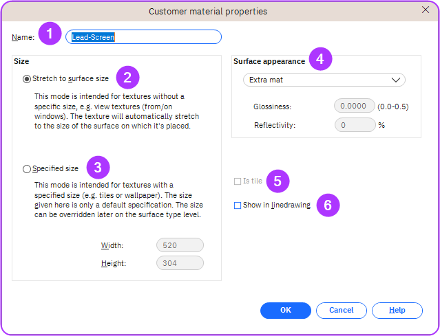 After successfully importing the material, the Customer material properties window opens. You can assign various functionalities to each imported material: