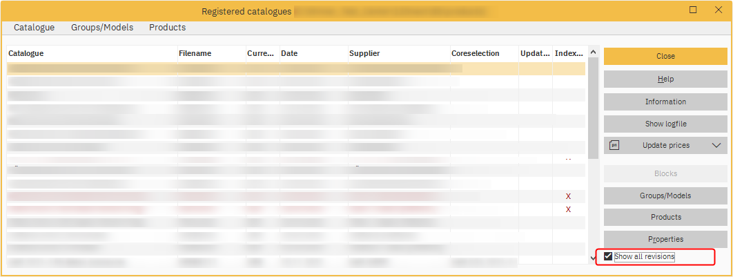 In the Registered catalogues window, you will need to tick Show all revisions to see older catalogue versions.