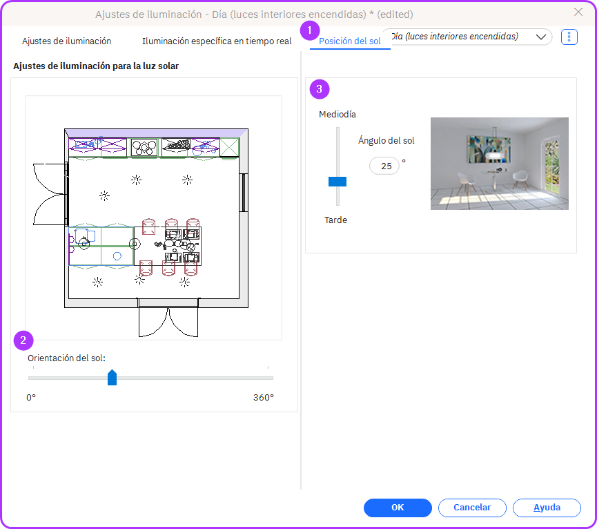 - La pestaña de posición del sol le permitirá seleccionar cómo entra la luz en el diseño a través de ventanas y puertas.