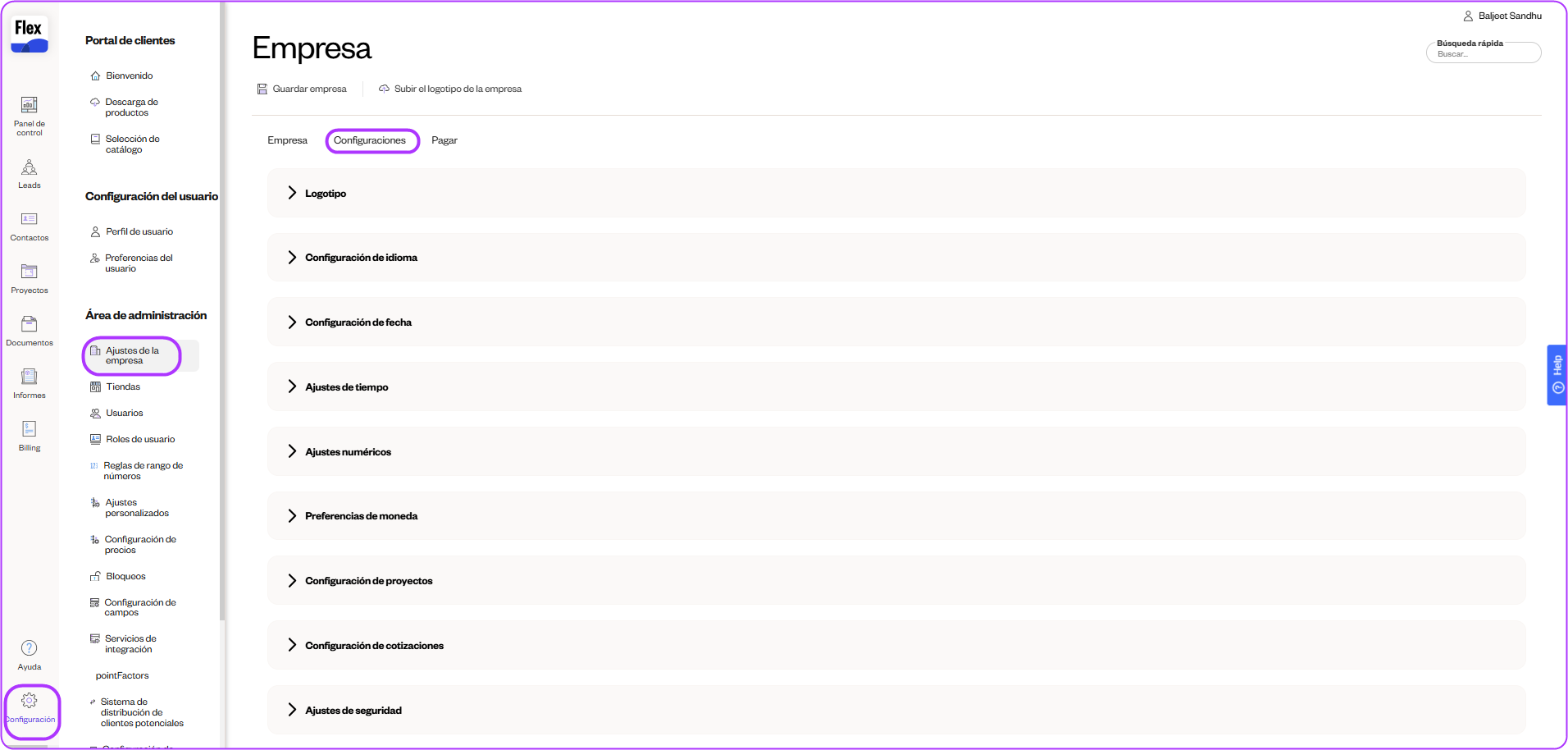 Aquí puede establecer su moneda, agregar o cambiar su logotipo, cómo se deben mostrar las fechas y horas, la configuración de proyectos, la configuración de cotizaciones y agregar medidas de seguridad como direcciones IP válidas desde las cuales se puede abrir Flex.