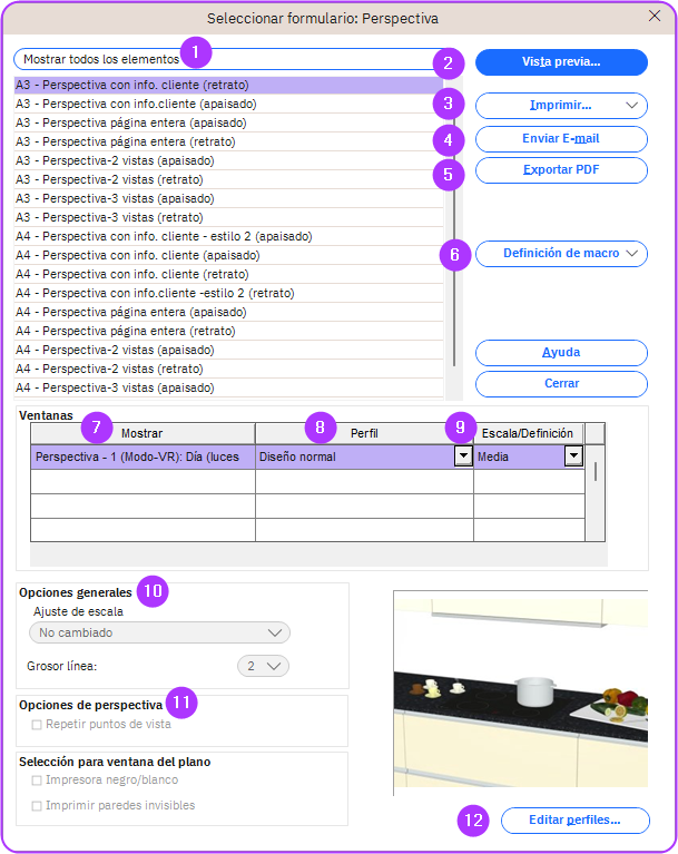 En Winner, cuando el usuario ha elegido imprimir Perspectiva, la ventana Seleccionar formulario: Perspectiva muestra la gama de opciones y formularios disponibles.