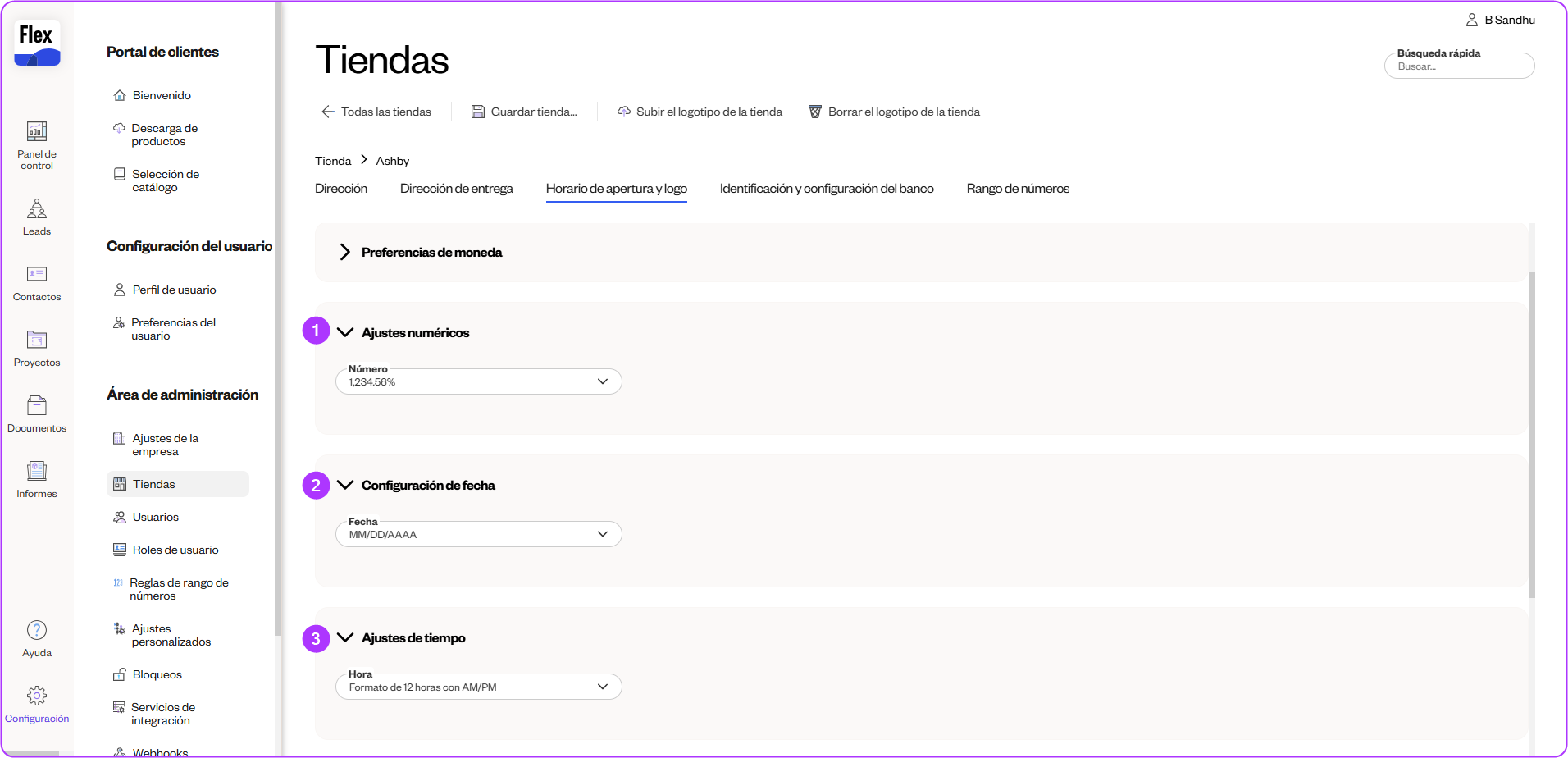 Establece el separador decimal para los datos numéricos mostrados en Flex. Además, configura cómo se muestran las fechas y las horas. Esto se puede configurar a nivel de Company y de Shop.