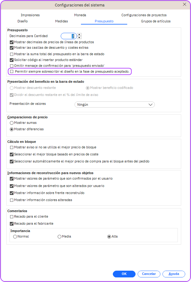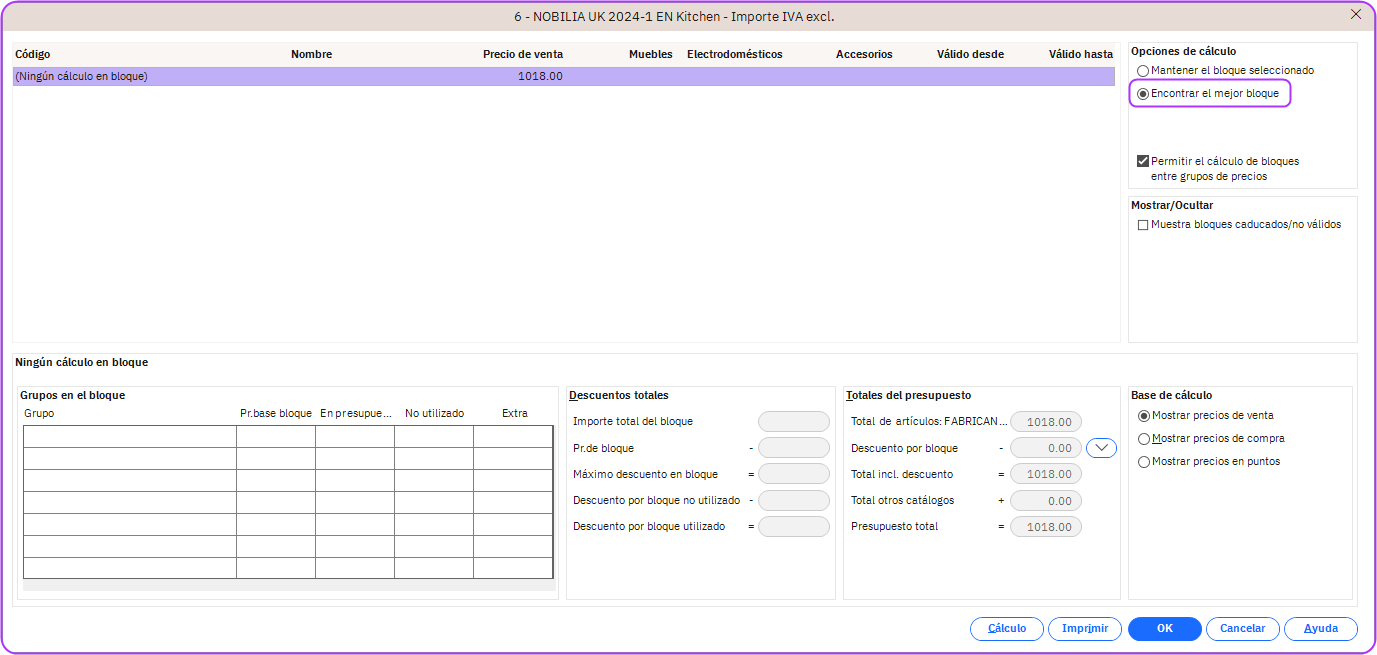 En los Ajustes del sistema de Presupuesto puedes seleccionar una opción para que Winner proponga automáticamente el mejor cálculo de bloque. Anteriormente, esta opción solo se preseleccionaba la primera vez que entrabas en la ventana de Cálculo de bloques y después volvía a Mantener bloque seleccionado. En esta versión se ha actualizado la regla de negocio para que la opción Buscar el mejor bloque siga siendo la opción preseleccionada hasta que hayas cambiado manualmente los ajustes de descuento de bloque o seleccionado otro bloque, o cuando el diseño tenga el estado Presupuesto enviado. Para más información sobre Cálculos de bloques haz clic aquí.
