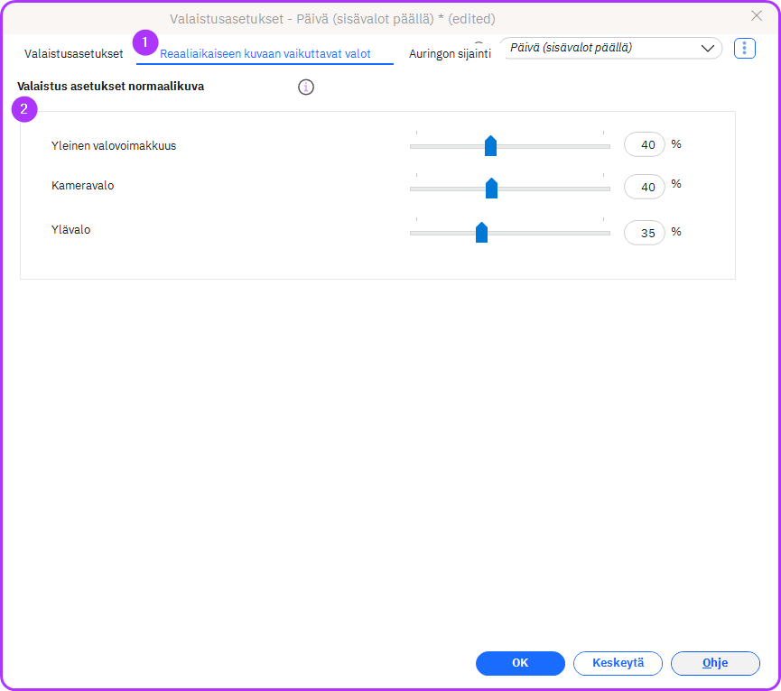 Versiosta 12.2a9 alkaen valaistusasetukset yhdistettiin kahdelta alueelta yhdeksi intuitiiviseksi valintaikkunaksi. Täällä voit muuttaa erilaisia asetuksia ja tallentaa ne valaistusprofiileiksi, joita voit helposti soveltaa useisiin suunnitelmiin. Alueita on kolme Valaistusasetukset, Reaaliaikaiseen kuvaan vaikuttavat valot ja, Auringon sijainti.