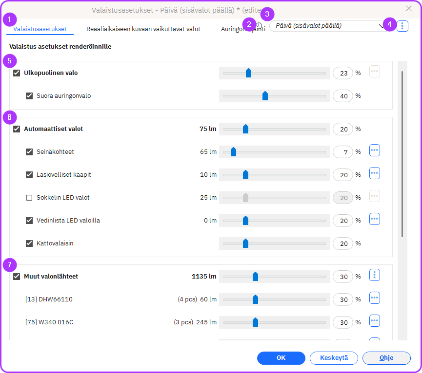Valaistusasetukset -välilehti näyttää kaikki suunnitelman valot. Näet valoryhmät Automaattiset valot ja lisätyt valaisimet ryhmässä Muut valonlähteet. Säädä valon voimakkuutta (lumeneja) liukusäätimillä tai syötä tietty luku prosenttiruutuun. Voit tehdä tarkempia säätöjä klikkaamalla Lisää toimintoja kuvaketta