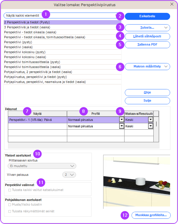 Mittakaava / Resoluutio - Kun tulostetaan perspektiivipiirustusta, tämä sarake näyttää tulosteen resoluution. Resoluutio, pikselien lukumäärä, voidaan asettaa matalaksi, keskitasoksi tai korkeaksi. Korkea resoluutio pidentää tulostusaikaa, esimerkiksi fotorealistisen piirustuksen tulostaminen kestää kauemmin kuin lyijykynäpiirustuksen.