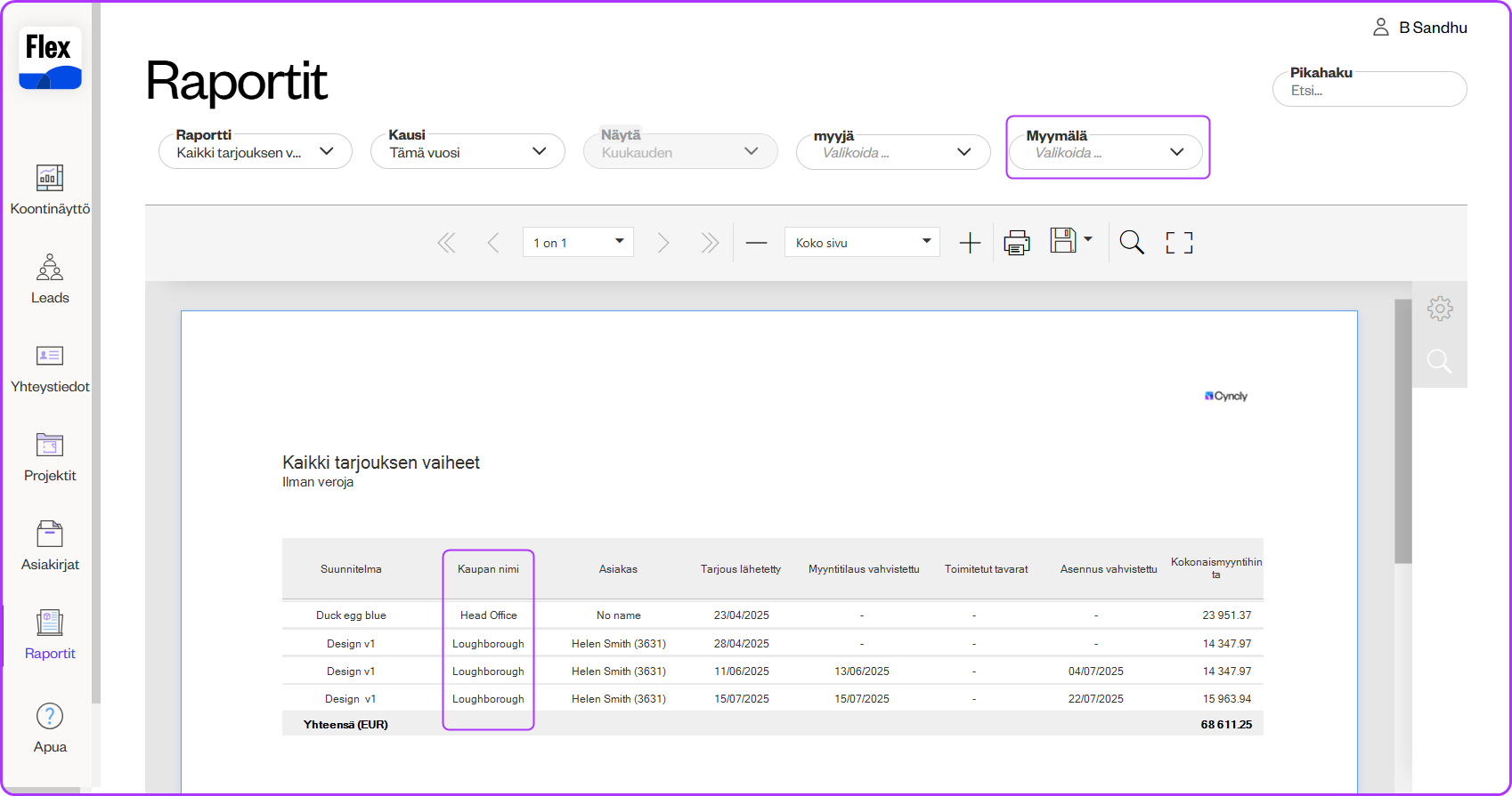 Kaikkien tarjousvaiheiden raporttia on parannettu lisäämällä siihen sarake, jossa on Myymälän nimi, jossa Projekti on. Näin voit lajitella tiedot myymälöihin, jotta voit lähettää oikeat tiedot asianmukaiselle tiimille.