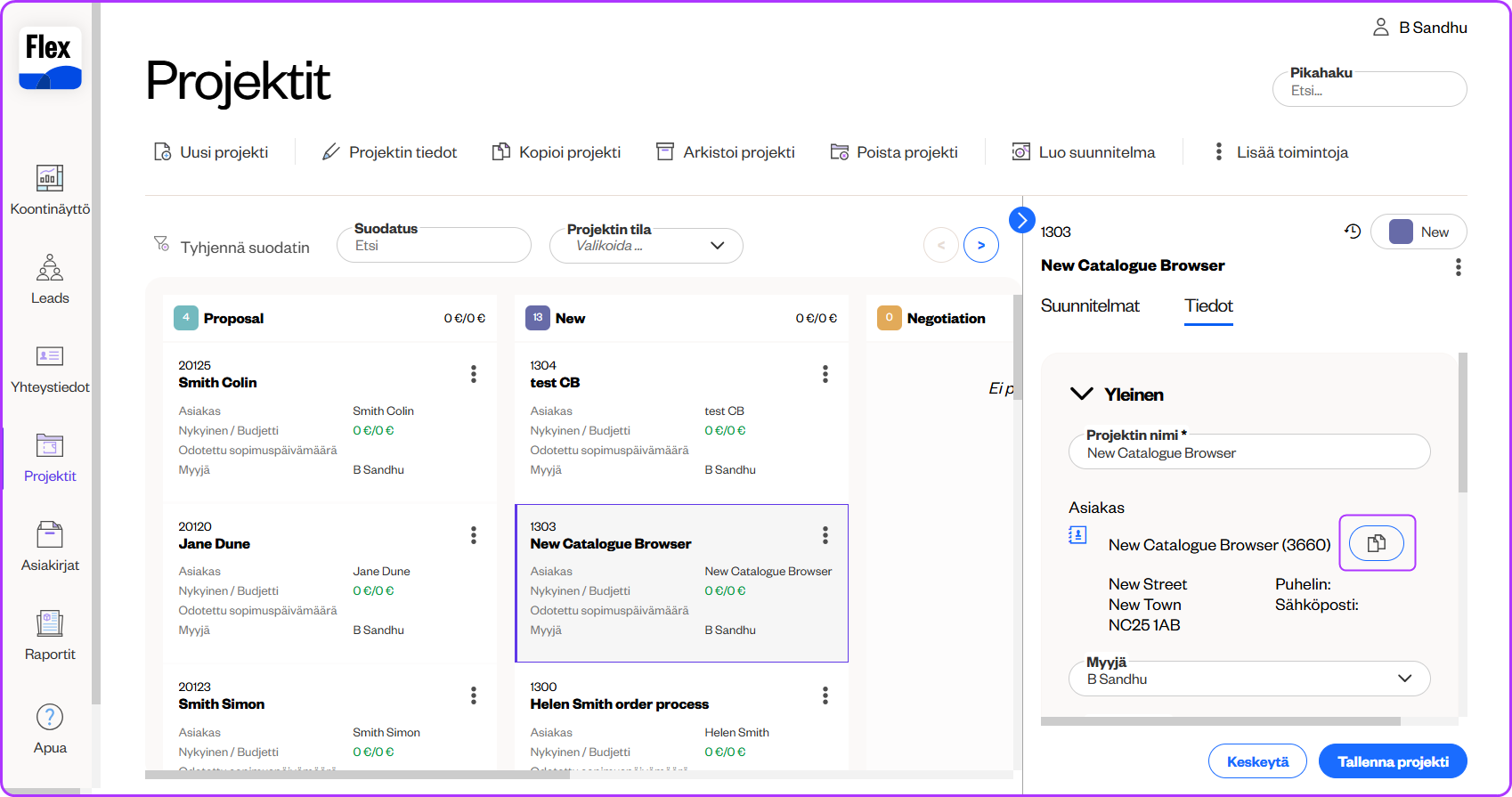 Flex-alustalla voit kopioida yhteystiedon tiedot leikepöydälle ja liittää ne toiseen ohjelmaan. Voit tehdä tämän kohdasta Projektin tiedot sekä sivupalkki Projektit osioissa. Saadaksesi lisätietoja Klikkaa tästä.