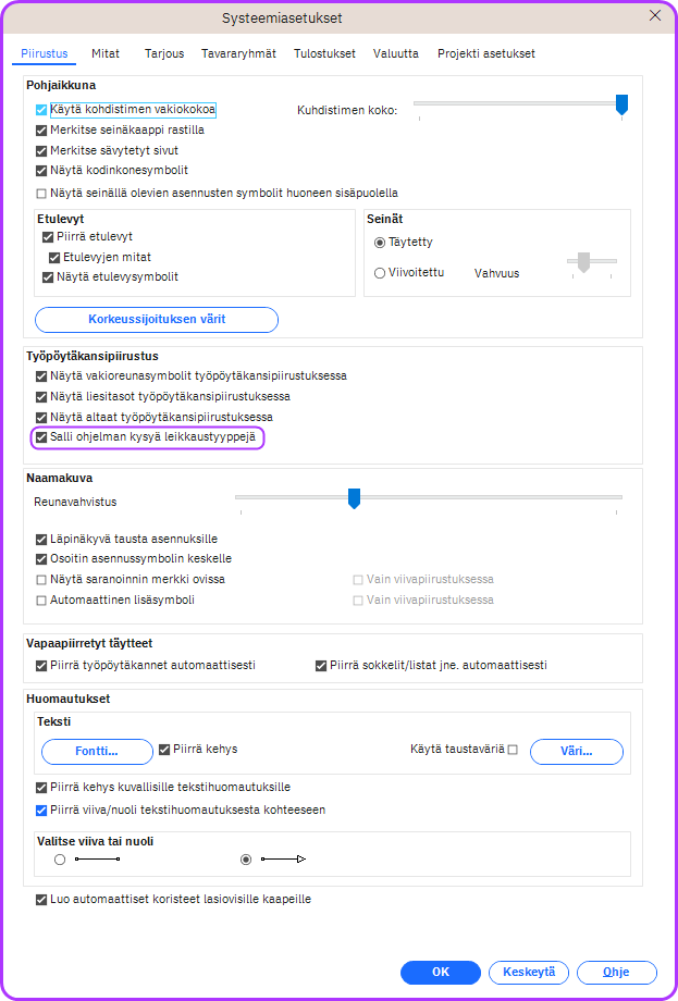 Työpöytäkansi tilassa, koodia määritettäessä ikkuna kysyy, pitäisikö leikkaukset tehdä paikan päällä. Winner käyttää nyt automaattisesti ehdotettua leikkaustyyppiä kaikille Projekteille kun Salli järjestelmän kysyä katkaisutyyppejä ei ole valittuna Systeemiasetuksissa, mikä poistaa ponnahdusikkunan, jossa pyydetään vahvistamaan leikkaustyyppi, ja säästää aikaa suunnittelun aikana.