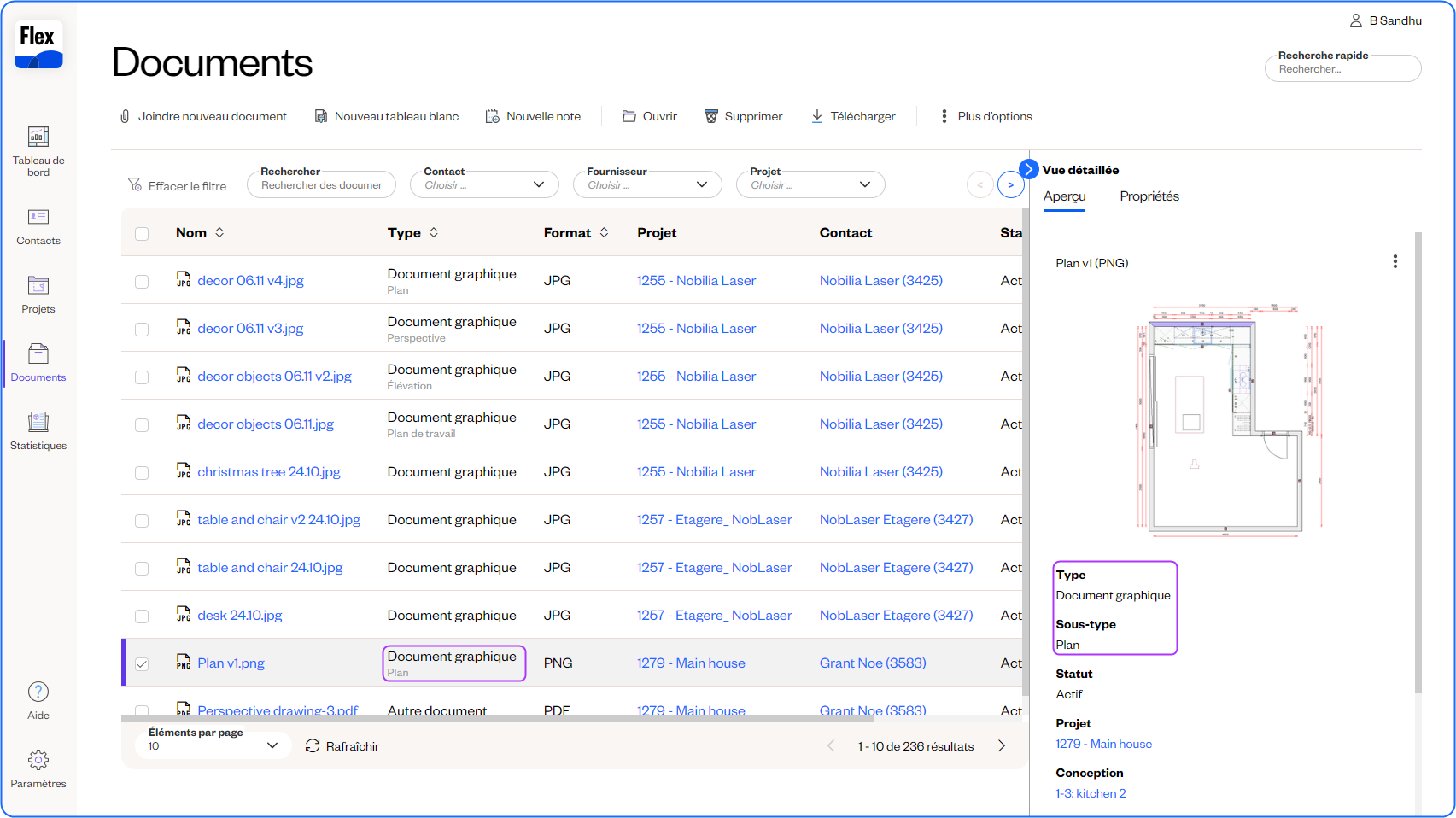 Nouveau sous-type pour les documents graphiques - Lors de l'enregistrement d'un document graphique sur la plateforme Flex, il disposera désormais d'une sous-catégorie de plan, perspective, élévation et plan de travail. Le sous-type peut également être filtré lors de la visualisation des documents sur la plateforme.