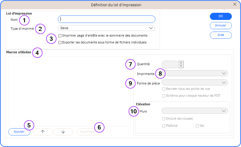 Devis: Lors de la sélection du type d'impression Devis, les macros d'impression pour les impressions graphiques, par exemple le plan, l'élévation et la perspective, et les mises en page pour l'impression du devis peuvent être ajoutées au lot.