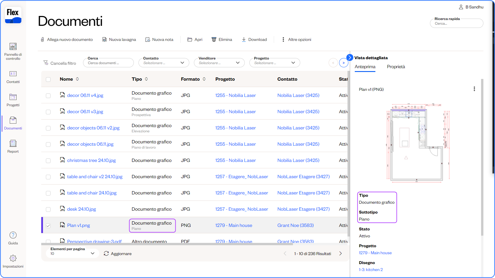 Nuovo sottotipo per i documenti grafici - Quando si salva un documento grafico sulla piattaforma Flex, ora sarà presente una sottocategoria di planimetria, prospettiva, prospetto e piano di lavoro. È possibile filtrare il sottotipo anche quando si visualizzano i documenti sulla piattaforma.