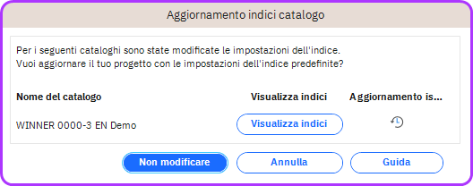 Convalida dell'indice all'apertura di un progetto- All'apertura di un progetto, Winner controllerà l'indice impostato per il progetto rispetto all'indice nell'elenco del catalogo o a livello di progetto. Se un progetto non utilizza l'indicizzazione più aggiornata, all'utente verrà chiesto se desidera aggiornare immediatamente gli indici con quelli predefiniti e avrà anche la possibilità di visualizzare gli indici o meno.