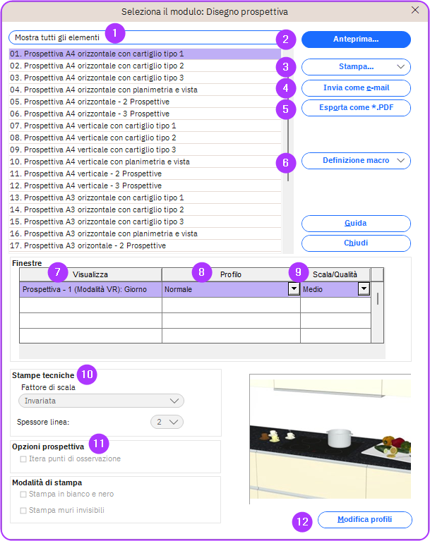 In Winner, quando l'utente sceglie di stampare un disegno prospettico, la finestra Seleziona il modulo: Disegno prospettiva mostra la gamma di opzioni e modelli disponibili.