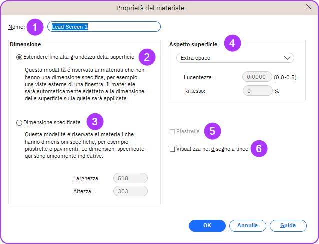 - Aspetto della superficie: Nel menu a discesa ci sono 6 modelli predefiniti da “Extra opaco” a “Lucido 100%”. La 7a opzione “definito dall'utente” può essere usata per definire manualmente i valori di Lucentezza e Riflettività.