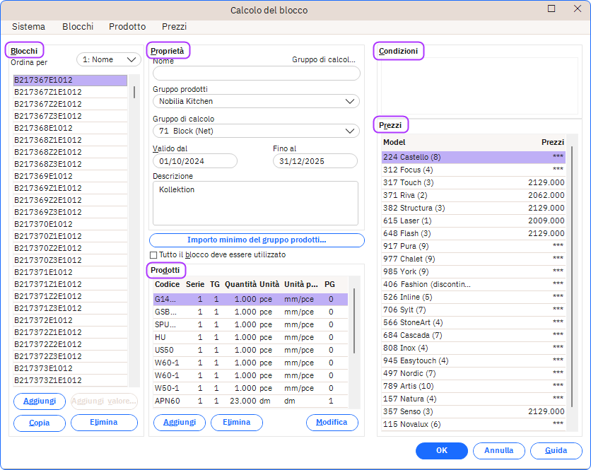 Quando si utilizzano blocchi valore, il prezzo nel gruppo caselle Prezzi sarà mostrato come 1.000 il che indica che il blocco è abilitato per un modello specifico. Tutti i modelli che mostrano *** non sono validi per il blocco corrente.