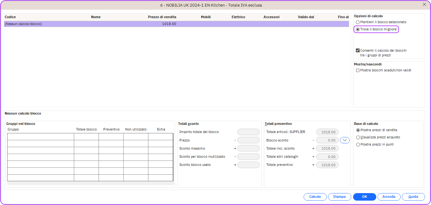 Nelle Impostazioni di sistema per Offerta puoi selezionare un’opzione per impostare Winner in modo che proponga automaticamente il miglior calcolo del blocco. In precedenza questa opzione veniva preselezionata solo la prima volta che accedevi alla finestra Calcolo del blocco, per poi tornare a Mantieni blocco selezionato. La regola aziendale è stata aggiornata in questa versione per mantenere ora l’opzione Trova il miglior blocco come opzione preselezionata fino a quando non avrai modificato manualmente le impostazioni di sconto del blocco o selezionato un altro blocco, oppure quando il progetto avrĂ lo stato Offerta inviata. Per maggiori informazioni sui Calcoli del blocco fai clic qui.Â