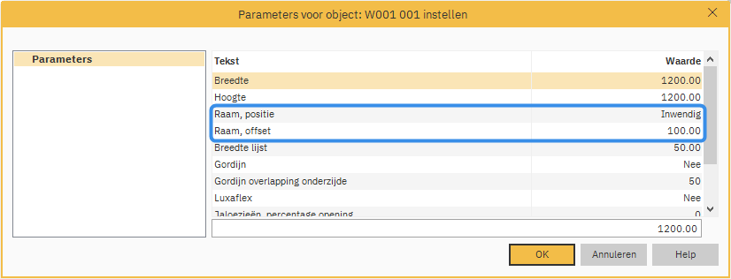 - Selecteer in het dialoogvenster Parameters instellen Venster positie en instellen als Binnen of Buiten, via de vervolgkeuzelijst onder aan het dialoogvenster.