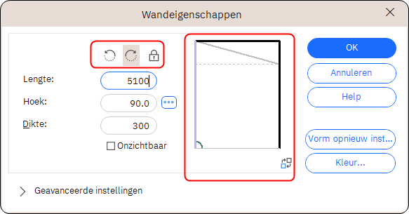 - Nadat u op OK heeft geklikt, ziet u dat de wandlengtes en -hoeken automatisch voor u zijn aangepast.