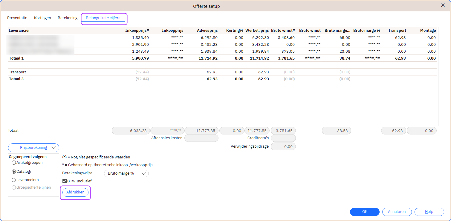 Voor een vergelijking kunt u een afdruk gebruiken in Offerte-opzet/samenvatting > Kerncijfers genaamd Overzicht berekeningen: