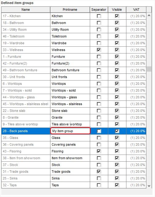 - Nadat u uw keuze heeft gemaakt, hernoemt u de geselecteerde Artikelgroep door de naam te veranderen in de Print naam kolom.